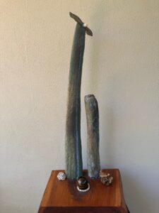 EAGLE EYE VERSUS TIGER EYE-wood, tiger eye stone, shells 17″ x 33″ x 11″